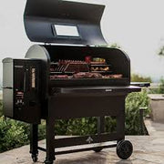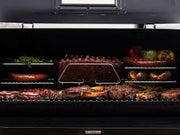 A motor turns the auger which feeds pellets into the firebox. There, a heat rod automatically ignites the pellets and a variable speed fan keeps them burning. The Venturi-style firebox is lined with vertical vents creating a burn pot cyclone of air flow for maximum heat and complete combustion of the pellets with minimal waste. A heat shield creates an even distribution of heat and pure hardwood smoke throughout the grill chamber.