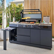 Designed for serious outdoor entertaining, the 6 burner Gasmate Apollo 6+ BBQ is available in a sleek black or white powder coated body with matching hood and contrasting black powder coated hood ends. A large glass viewing window, stainless steel fascia, durable side shelves, and a small cabinet under the right side shelf combine smart design with rugged style. The left side burner cabinet features a lift-up door that transforms into a handy shelf, while the right shelf includes a built-in ice or storage tub with a bamboo cutting board. Powered by stainless steel tube burners delivering 90.6MJ/h, it features cast iron hot plates, grill plates, a stainless steel warming rack, and precision digital control with Bluetooth/WiFi smartphone app connectivity. LED-lit knobs complete a BBQ built to perform — and built to impress.